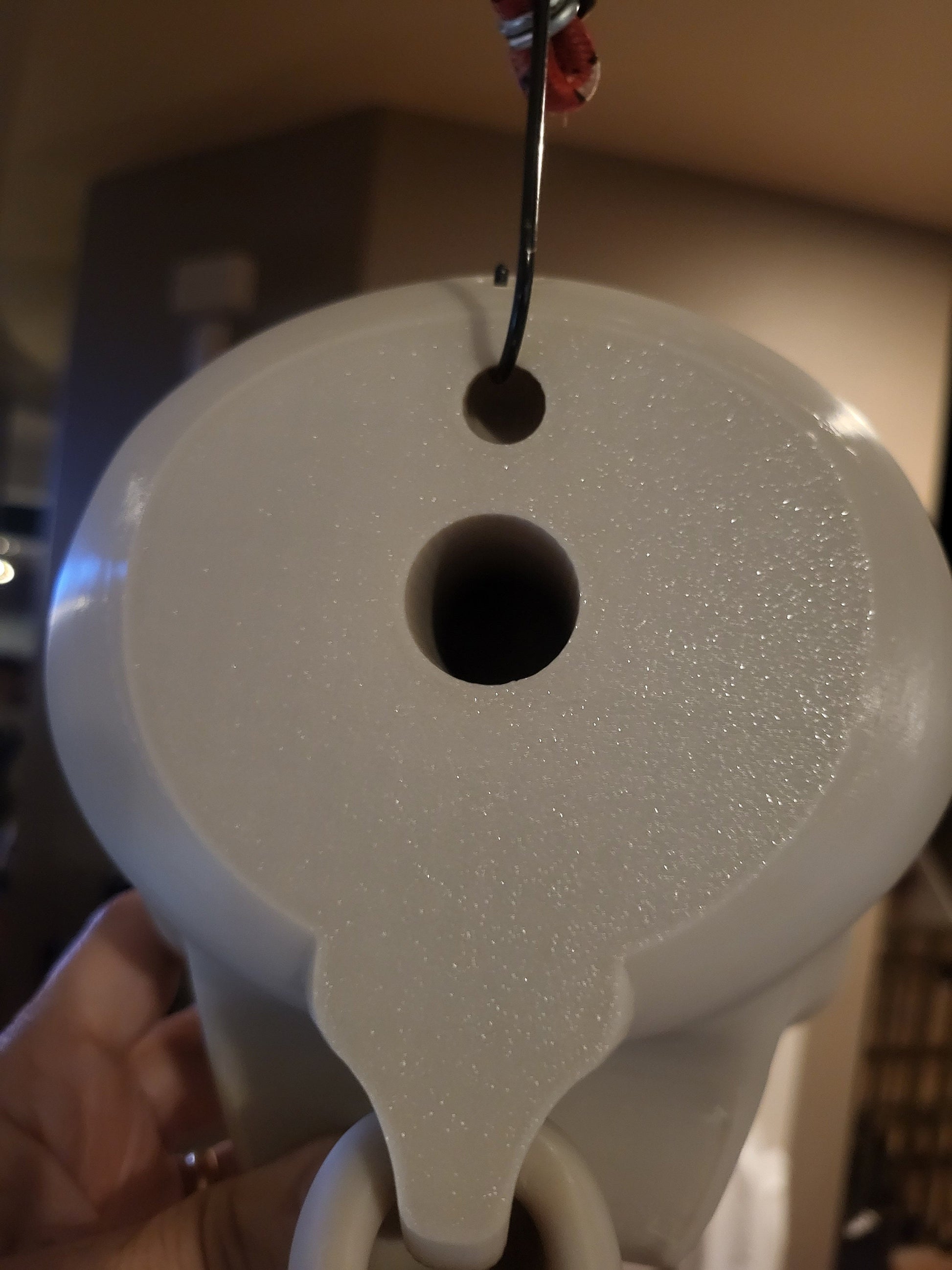 He is extremely flexible and can sit, etc. There are two methods of hanging him. There are two small holes in the back of the head to run a cord of bungie through, as I did, or a larger horizontal hole intended for a rod and stand setup.