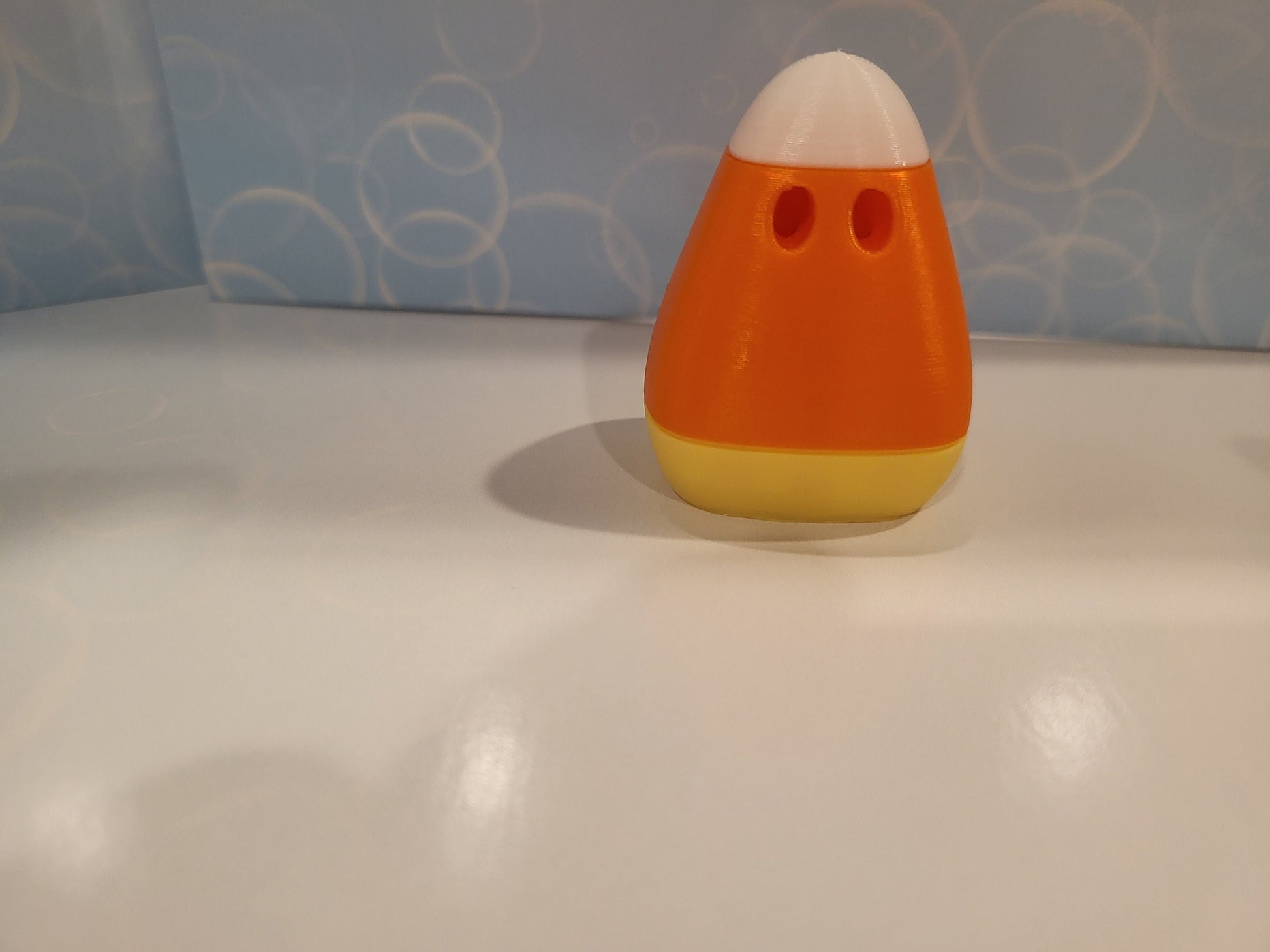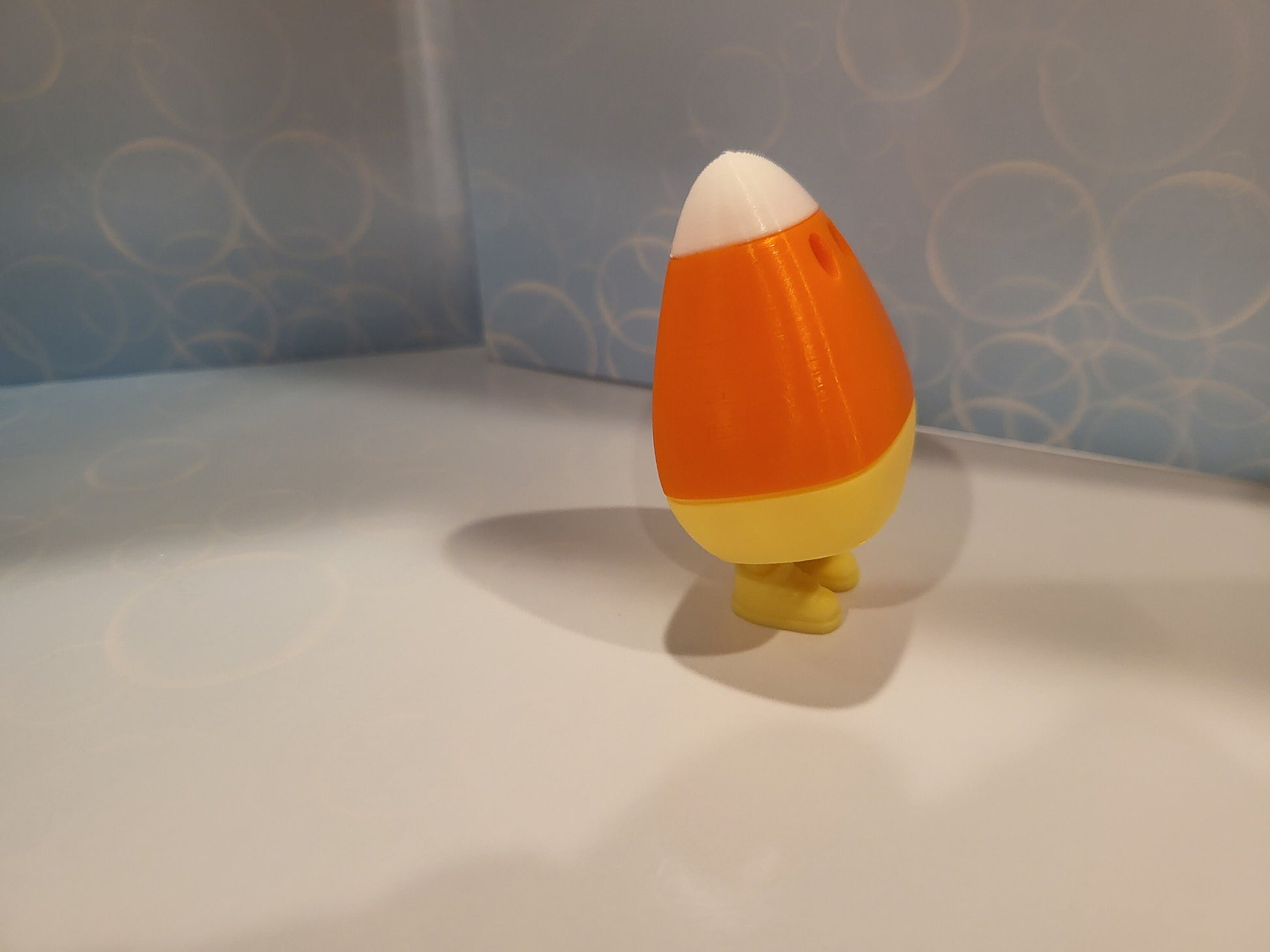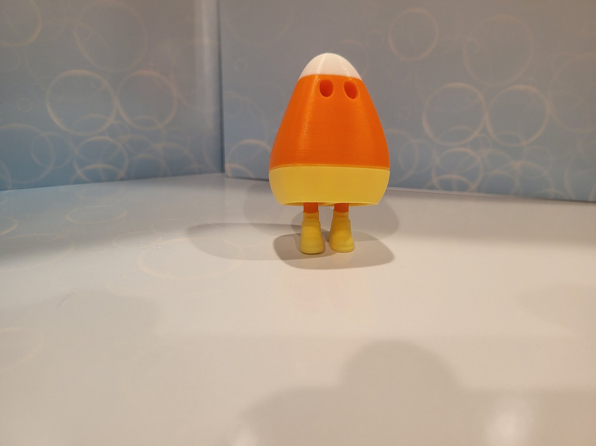 Cute Halloween Candi Corn ghost with legs! It will stand on its own, and with a gentle tap, it will collapse down so that its legs are hidden.